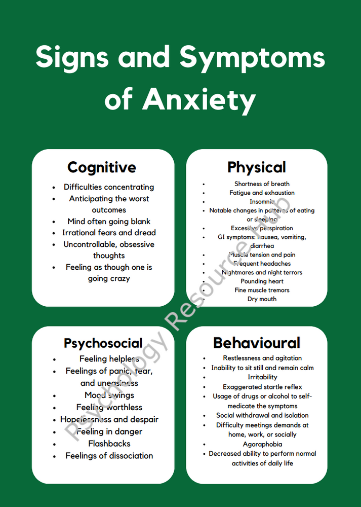 This psychoeducation poster provides a concise overview of anxiety symptoms, covering cognitive, behavioural, psychosocial, and physical symptoms.