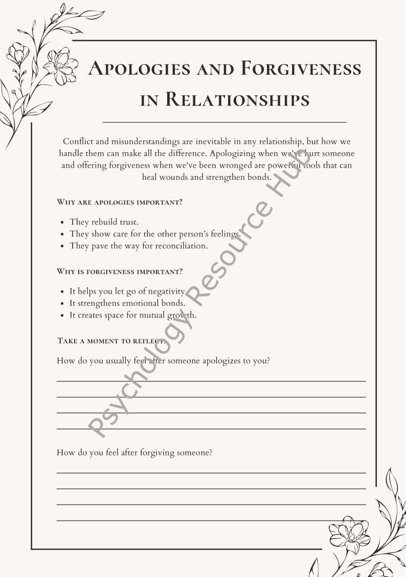 These worksheets explore the essential role of apologies and forgiveness in repairing and strengthening relationships. It includes exercises to help clients express remorse, seek forgiveness, and rebuild trust after conflict or betrayal. Perfect for individual or couples therapy, this resource equips psychologists and counsellors with practical strategies to support clients in navigating challenging conversations and fostering emotional healing.