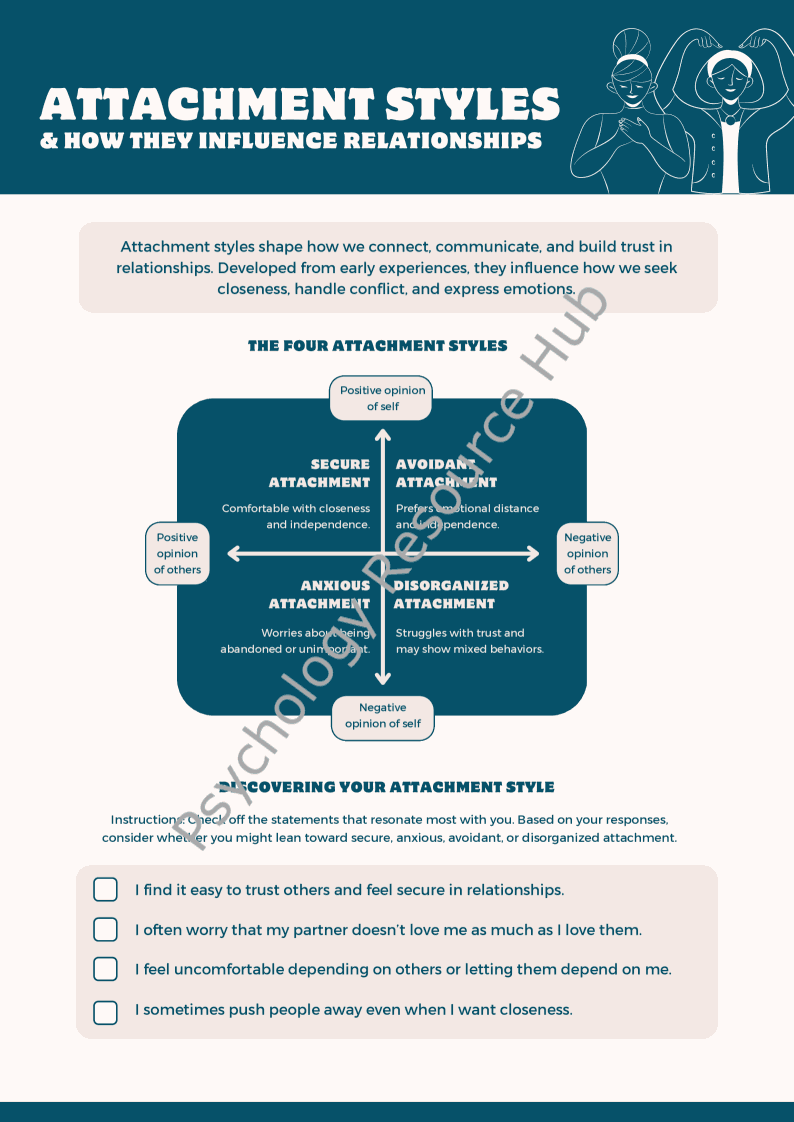 This resource provides an overview of the four primary attachment styles and their impact on relationships. It includes reflective exercises to help clients identify their own attachment style and understand how it influences their interactions and emotional needs.