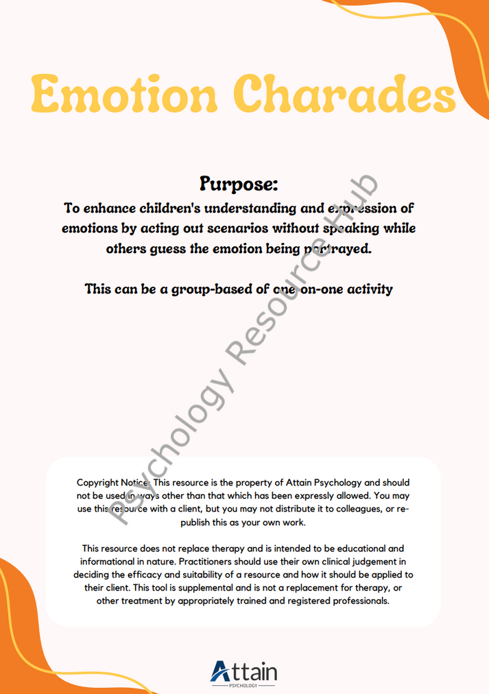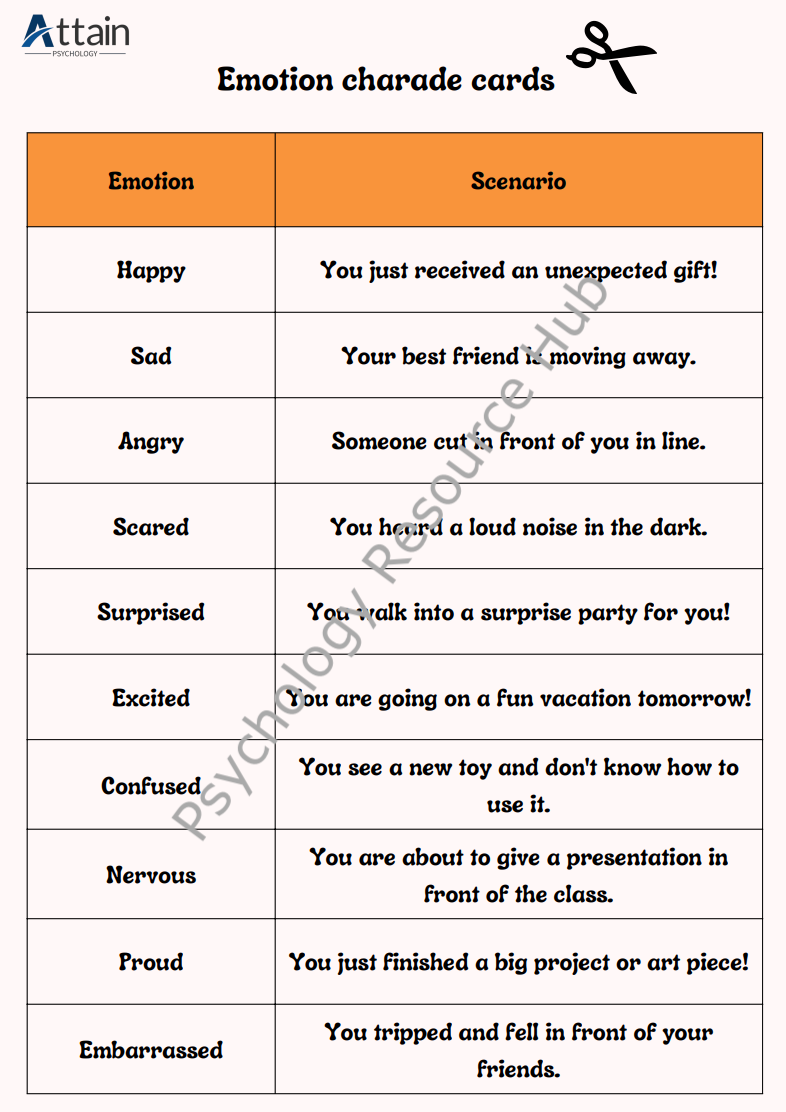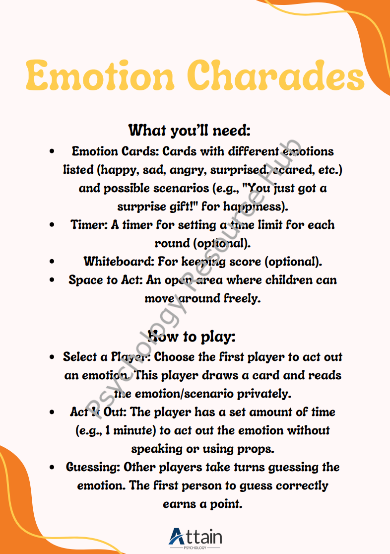 To enhance children's understanding and expression of emotions by acting out scenarios without speaking while others guess the emotion being portrayed. This can be a group-based of one-on-one activity perfect for helping children to develop their emotion development and emotion literacy.