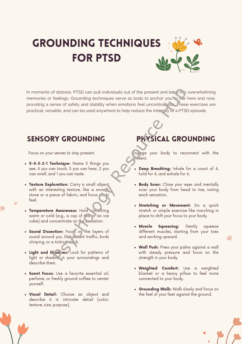 Therapists and counsellors can use this resource to teach grounding strategies that empower clients to stay present and reduce the impact of trauma and PTSD symptoms.