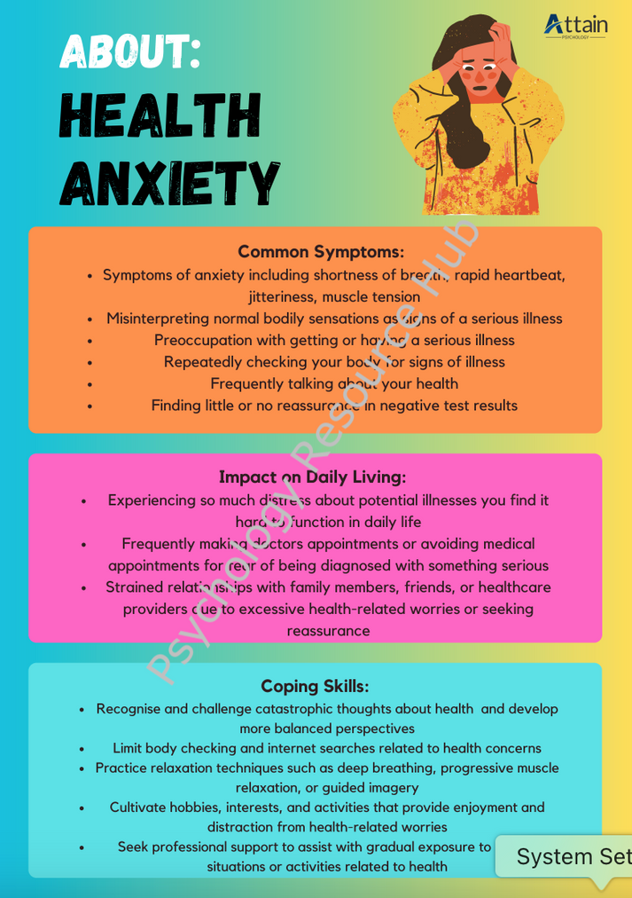 This poster features an overview of the main signs and symptoms of health anxiety, including common symptoms, impact on daily living, and includes some recommended coping skills to help manage health anxiety.