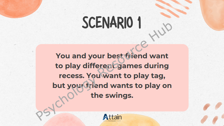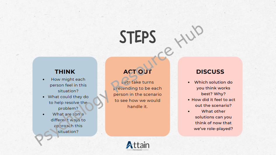 Build problem solving skills through roleplay, reflection, and discussion. This tool is a great way to help young clients develop their social skills, critical thinking, and problem solving through guided role play. Work with your client to review each scenario, act out how it would be done, reflect on how the situation went and consider what could have been done differently.
