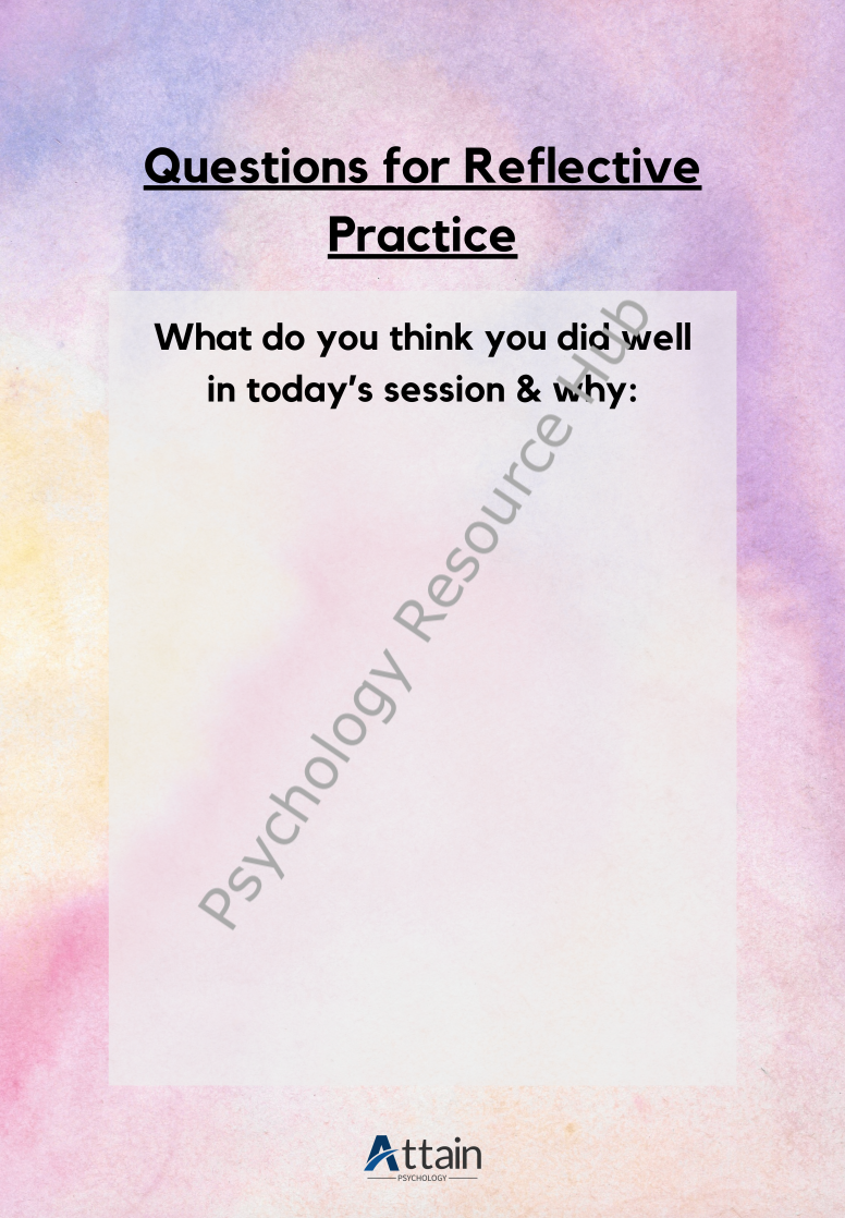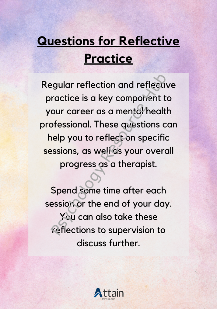 Regular reflection and reflective practice is a key component to your career as a mental health professional. These questions can help you to reflect on specific sessions, as well as your overall progress as a therapist. Spend some time after each session or the end of your day. You can also take these reflections to supervision to discuss further.