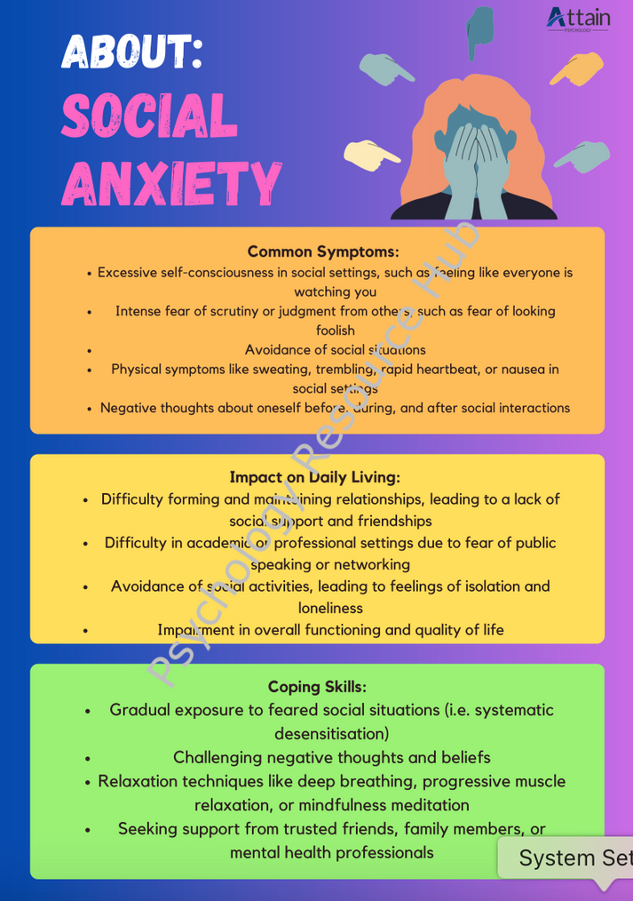 This poster features an overview of the main signs and symptoms of social anxiety, including common symptoms, impact on daily living, and includes some recommended coping skills to help manage social anxiety.