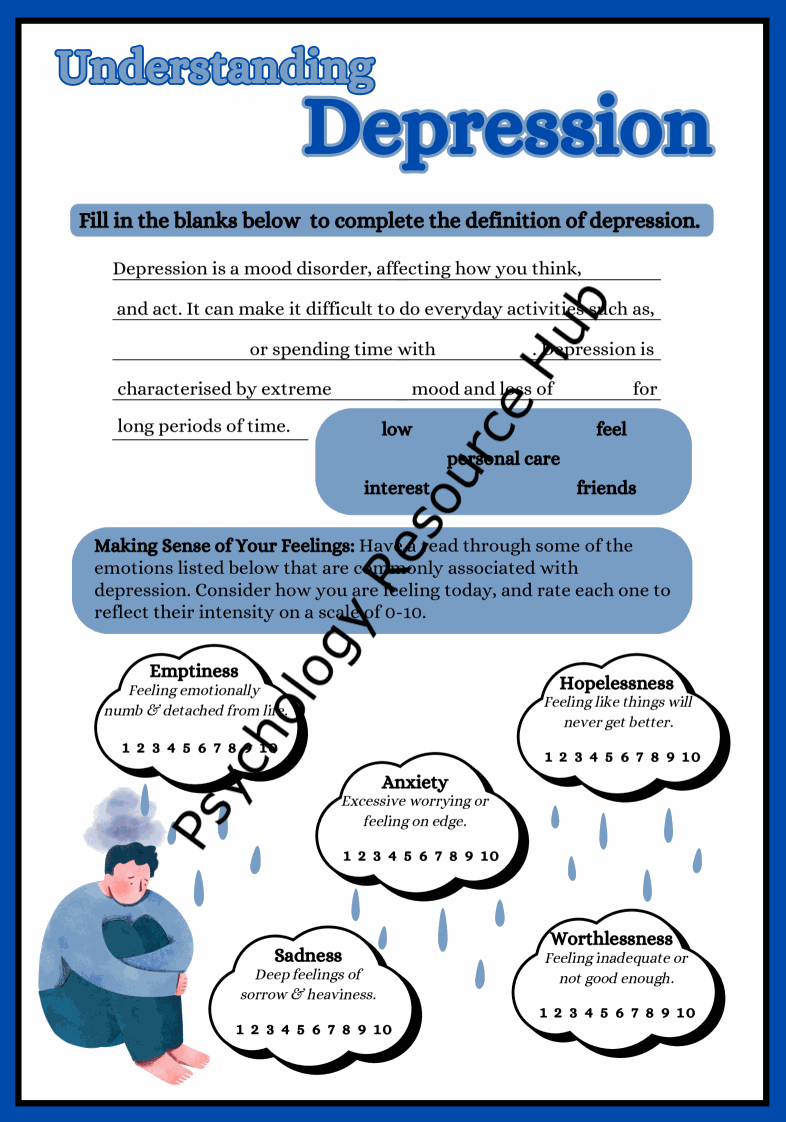 This resource offers an exploration of depression, helping individuals and their loved ones understand its effects on thoughts, emotions, and behaviours. It includes reflective prompts to encourage self-awareness and practical strategies for improving mood and coping with challenges.